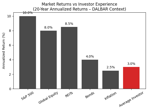 In dollar terms, a $100,000 investment translates to about $672,750 for the S&P 500 and about $180,611 for the average investor. That's a $492,139 gap. It's not just a return difference, it’s nearly 4x more wealth by simply staying invested vs behaving poorly.